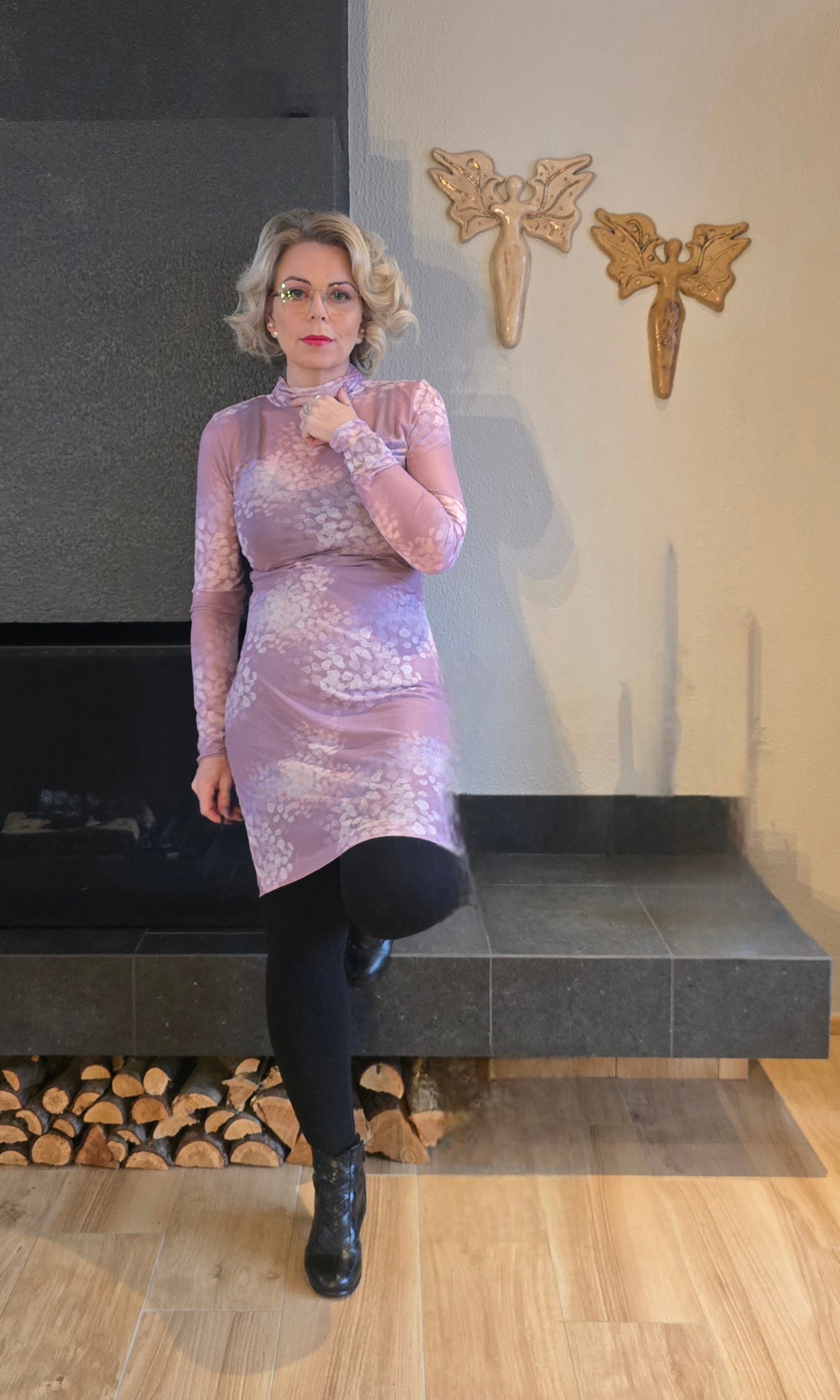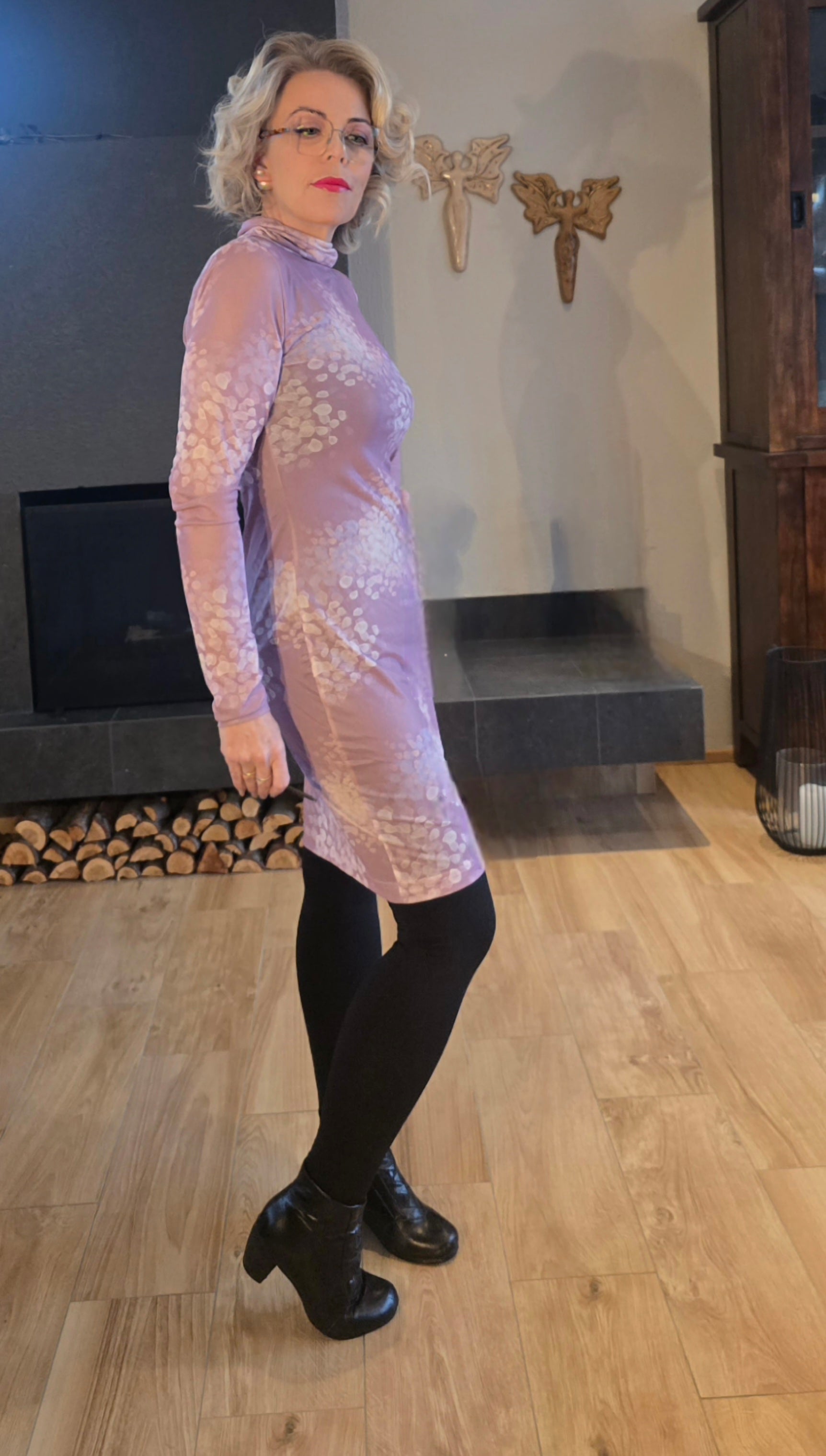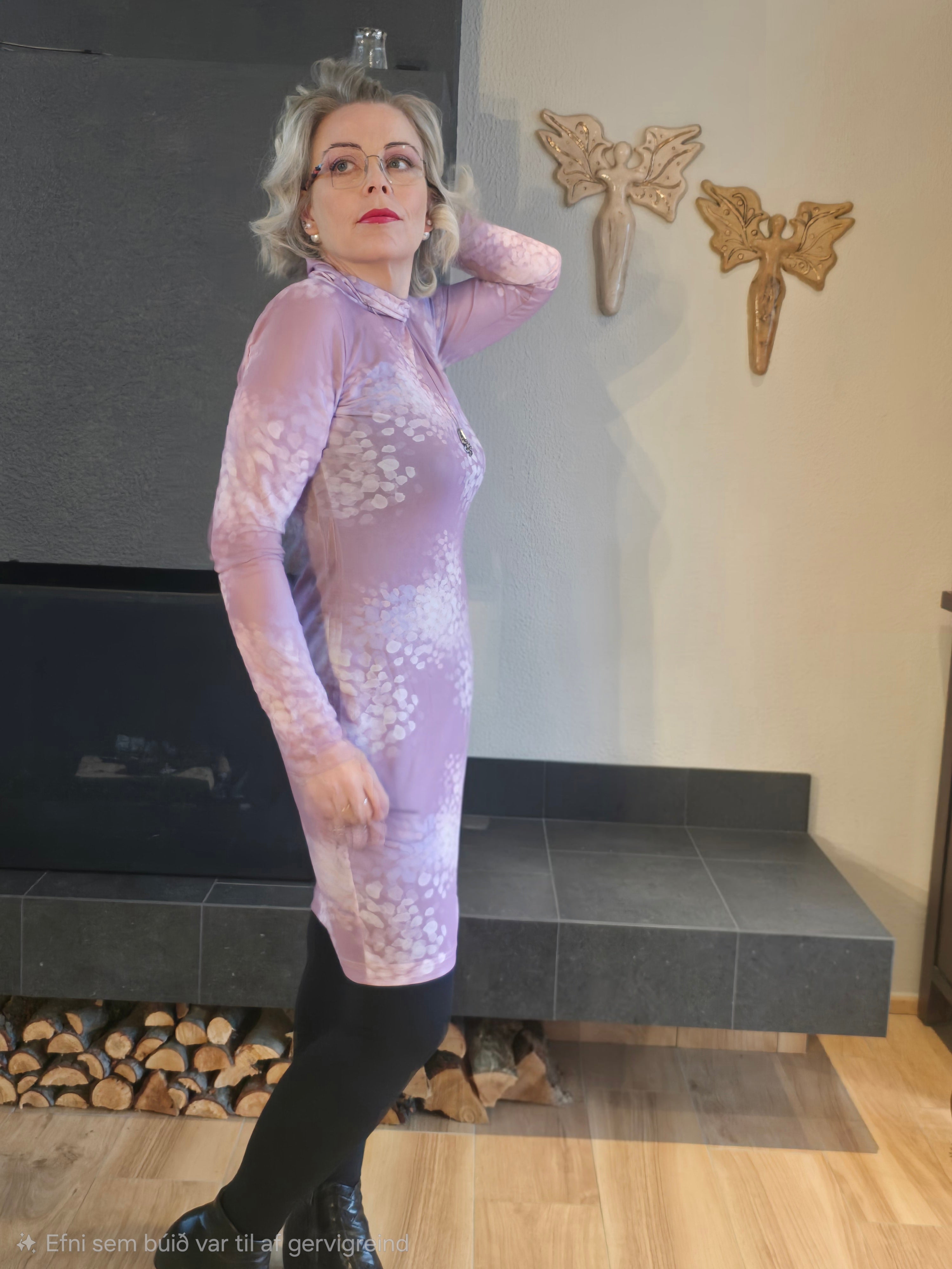 Hann er dásamlega mjúkur og þægilegur, sniðið er einfalt en þó aðeins tekið inn í mittið og víkki svo aftur um mjaðamasvæðið. Kraginn á honum er hár en afskaplega mjúkur og fellur því létt niður og þrengir ekki að hálsinum. Mesh-ið er teygjanlegt sem gerir kjólin afskaplega klæðilegan.