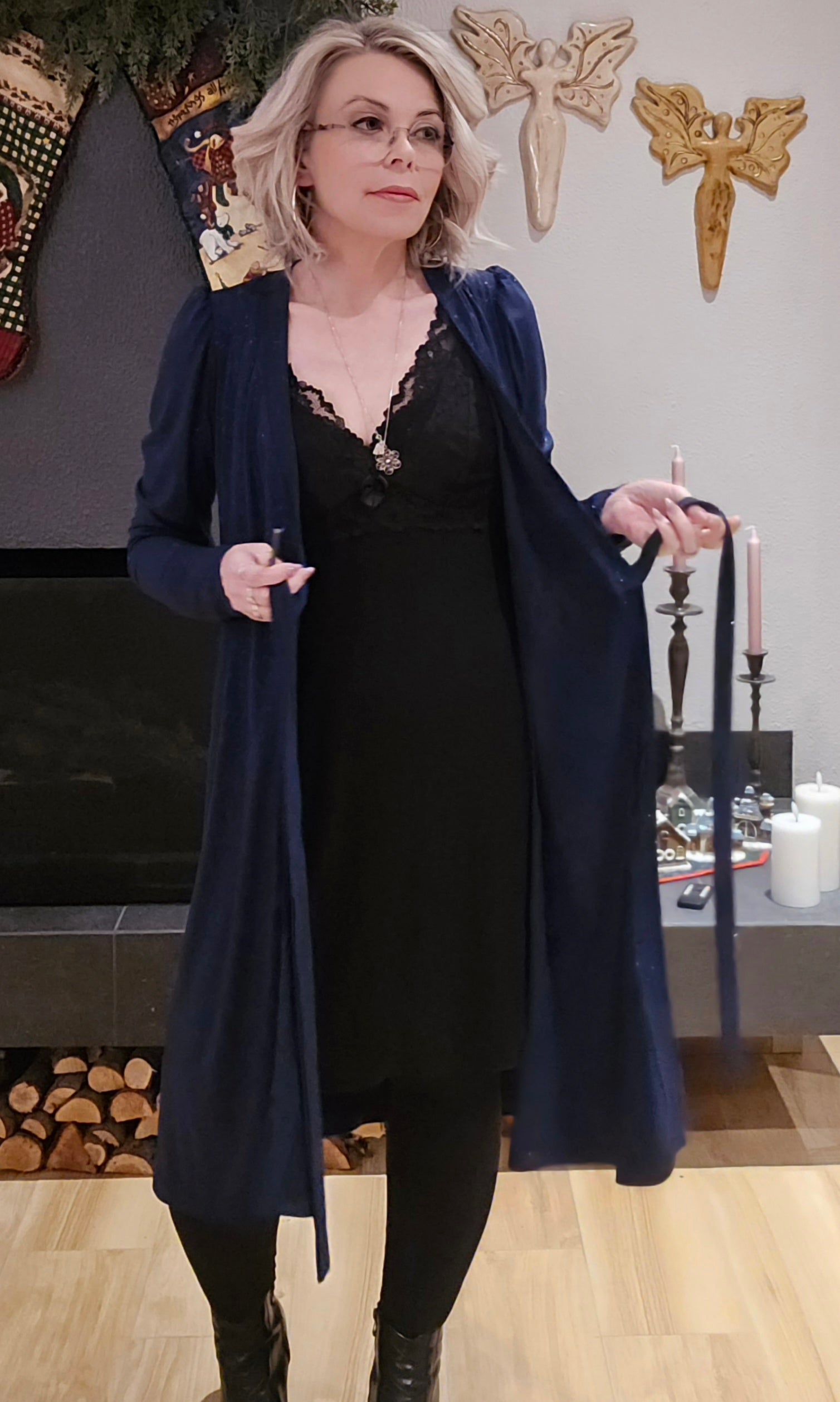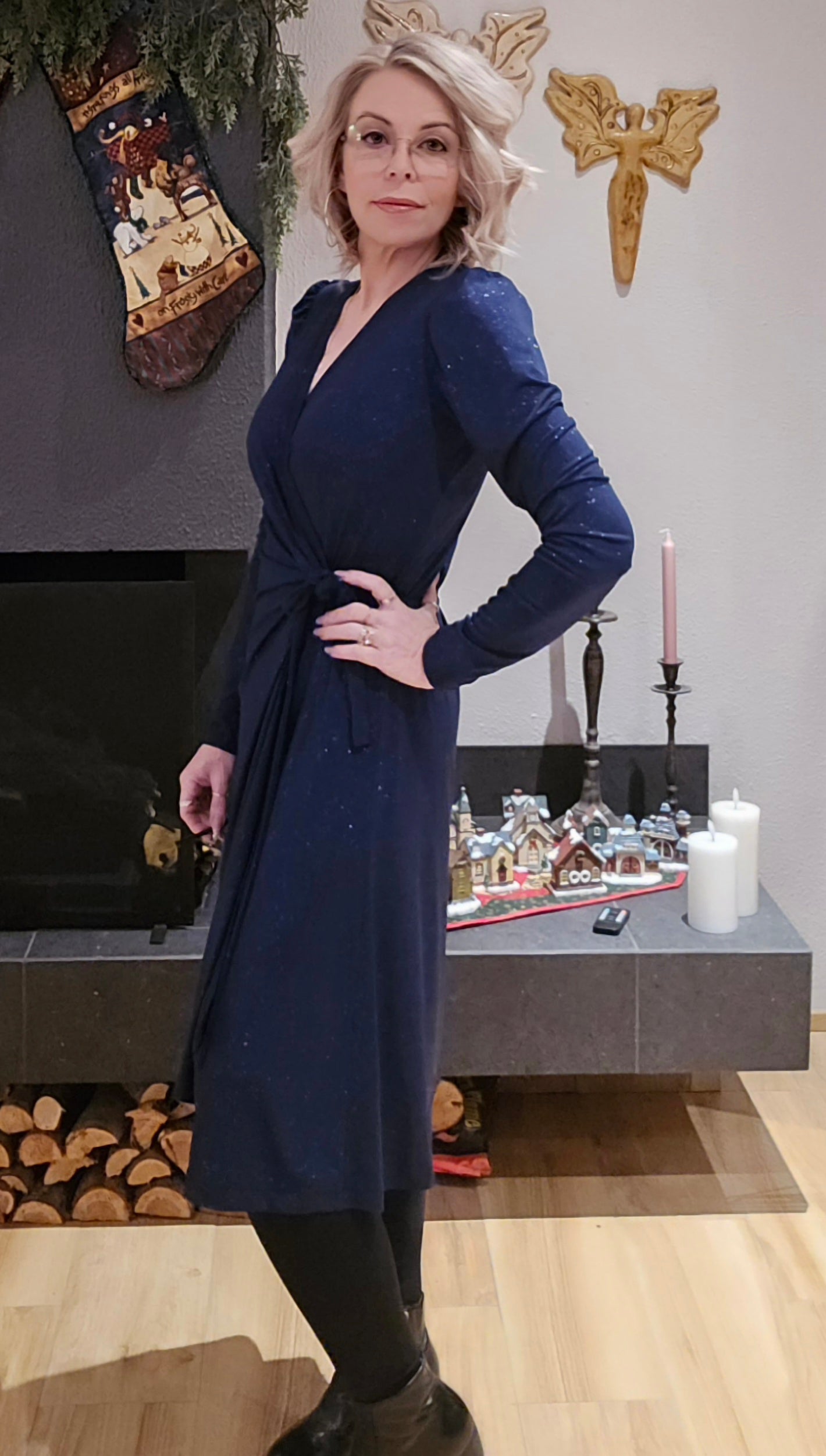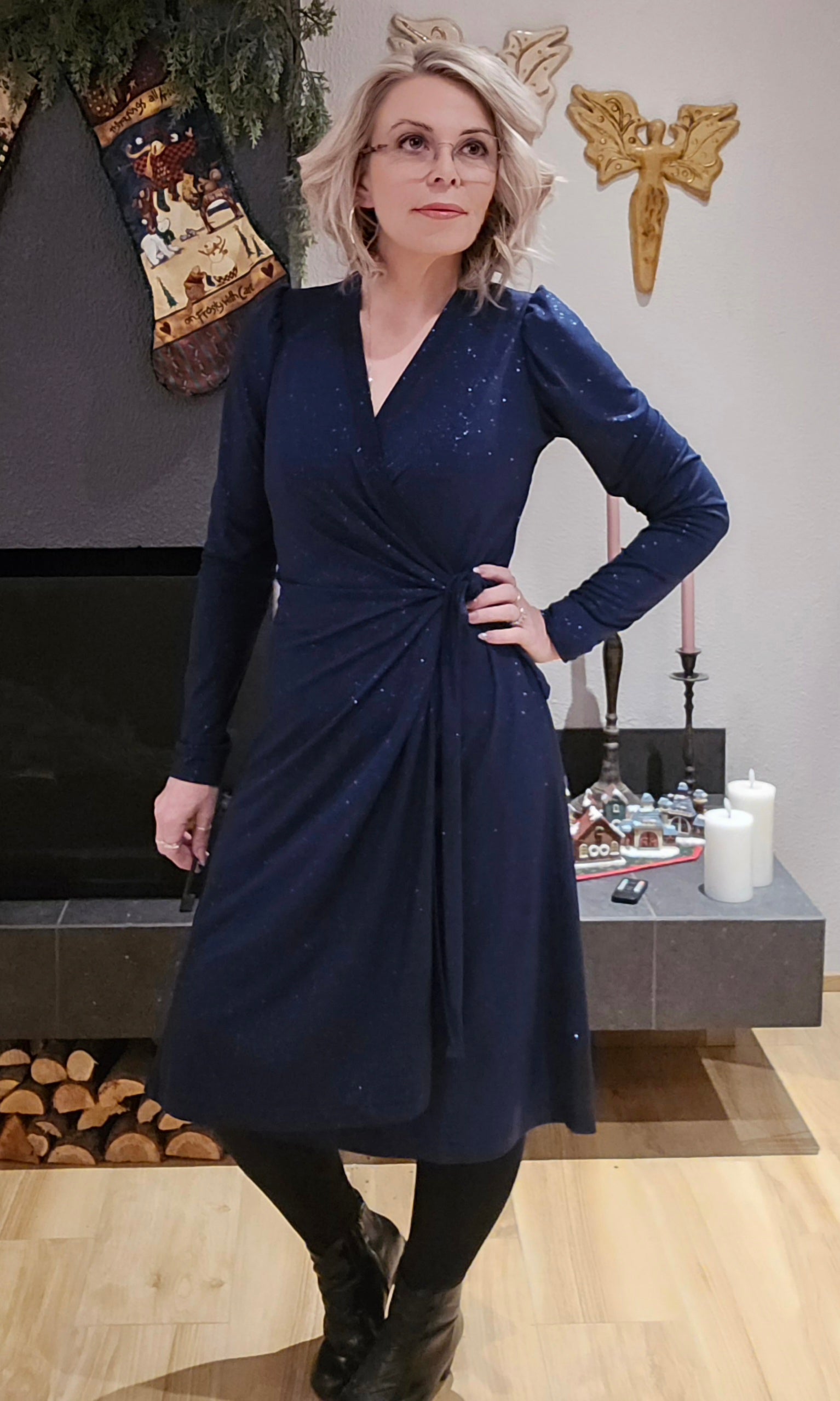 Kristín er þægilegur wrap glimmer kjóll.